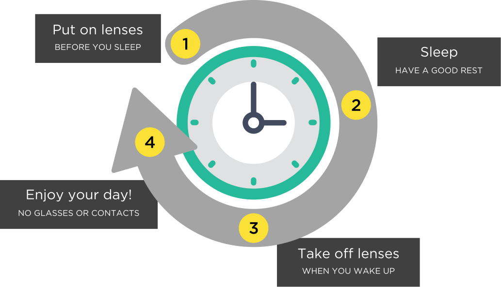 Orthokeratology (Ortho K) contact lenses are specifically designed rigid or hard contact lenses that you wear while you sleep. These lenses rest on the surface of the eye and trap a reserve of tears to gently reshape the cornea. Once the lenses have been worn overnight the newly shaped cornea provides clear vision throughout the day, eliminating the need for glasses or regular contact lenses. The reshaping of the cornea is temporary and reversible, so the lenses should be used every night to ensure the cornea’s shape and maintaining clear vision.