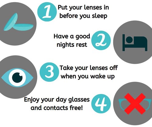 Ortho K is a non-surgical process which uses therapeutic contact lenses that the patient sleeps in at night. On waking the lenses are removed and clear vision is restored without the need for glasses or contact lenses throughout the day. The Ortho K lenses gently reshape the cornea to provide the wearer with clear vision. The effect is reversible and the lenses must be worn each night. Initially it can take a few nights of wear before good vision is achieved, however this is dependent on the degree of myopia.